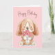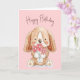 Chien chiot aquarelle avec fleur rose sur arrière - plan rose vif avec texte d'anniversaire heureux. La couleur Arrière - plan peut être modifiée. Le texte est modifiable.