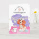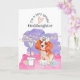 Une jolie illustration adorable d'un chiot Cavalier du roi Charles Espaniel entouré d'une éclaboussure d'aquarelle rose et violette, de lampes à cordes, d'un plante blanc fantaisiste faisant un croquis cardiaque et d'un cupcake au gel blanc et à la cerise rouge. Elle a de jolies fleurs dans ses cheveux et les mots, pour une fillette très spéciale, apparaissent au-dessus d'un modèle voûté. Le libellé intérieur peut être personnalisé en fonction de vos besoins en tant que parrain.