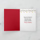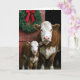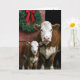 A Hereford cow and her calf stand at the entrance of a red, rustic barn, decorated with a green pine wreath and red bow.