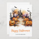 Carte d'Halloween aquarelle avec jack-o-lanternes, chauve-souris et un manoir hanté. De mignons fantômes à l'arrière. Personnalisez facilement cette carte d'Halloween avec votre nom de famille et votre texte.