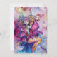 Clown rose, coloré, capricieux, drôle jouant du bugle avec un hibou expressif et des notes musicales joyeuses, fleurs, feuilles en rouge vif, fuchsia, violet, violet, bleu, couleurs blanches, aquarelle de Bulgan Lumini (c)