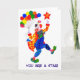 Une carte de voeux lumineuse et joyeuse qui peut être utilisée comme une note de remerciement ou une carte de félicitations car elle est laissée vide à l'intérieur pour votre propre message. Le collage en papier peint à la main est d'un clown joyeux avec ballons et une étoile. Voir aussi les cadeaux et les vêtements correspondants.