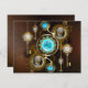 Turquoise lenses with antique watch with brass gears and golden keys on rusty, brown background. Steampunk style.