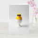 This design shows a fluffy yellow chick-like bird peeking out of a cracked white eggshell that sits neatly in a simple egg cup, all set against a bright white studio background. Tiny round dark sunglasses rest on its face, giving it a confident look that feels like a flirty wink toward someone just out of frame 🐇. Soft, gentle lighting falls from above, tracing the jagged shell edge and laying faint shadows beneath the cup without pulling attention away from the little character. The rich yellow feathers stand out strongly against the pale setting, and the sharp detail makes each strand of down look touchable. Near the top, a short Easter greeting appears in small, rounded lettering, printed in a light gray tone that stays subtle. A smaller line of text sits near the bottom in soft pastel pink, like a quiet note meant for a close friend 🌷. The broken shell curves around the bird’s cheeks, and the glossy lenses catch a tiny white highlight.