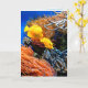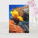 Photo de corail sous-marin tropical dans la mer bleue. Le corail est d'une belle couleur orange vif, traversé par deux petits poissons tropicaux jaunes.