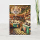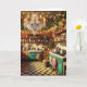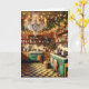 Nous vous souhaitons un Noël à l'ancienne et un Joyeux Nouvel An. le texte intérieur de la carte peut être personnalisé, afin que vous puissiez ajouter votre nom si vous le souhaitez ou modifier le salut. Joli rose rétro, turquoise avec carrelage noir et blanc au sol cuisine avec lustre, salle pleine de décorations de vacances, couronnes de vacances et lumières de Noël.