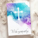 Belle carte de condoléances avec une croix blanche sur un splash violet et aqua et le texte "Avec sympathie" sur le devant. Texte personnalisé à l'intérieur : "Nous sommes tellement désolés de votre perte. Puissiez-vous trouver paix et confort pendant cette période difficile"