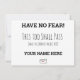 "202X Got You Down ?" en gras, en caractères noirs avec "Turn Over" écrit à côté dans une police délicate. La photo sur le devant montre un homme assis et regardant par sa fenêtre le symbole du coronavirus. Au verso se trouvent les mots "N'ayez pas peur" dans la même police en gras avec "Cela aussi passera" dans la même police délicate. Dans les petites lettres entre parenthèses, en dessous, il est dit (et le plus tôt sera le mieux!). Tous les éléments peuvent être customisés ou supprimés.