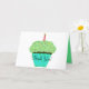 Merci d'anniversaire écrit en écriture noire. Un cupcake au chocolat délicieux au gel vert, un look d'arroses et une bougie colorée à la flamme festive. Carte d'art originale Verse Design © TamiraZDesigns.