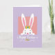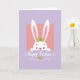 This card shows a stylized white bunny 🐰 with long ears peeking from behind a rounded peachy-pink rectangular frame, as if leaning in to greet someone close. Its simple dark eyes and tiny nose give it a gentle, friendly look, like it’s sharing a quiet moment with you. A small bow on its head mixes orange, green, and blue, adding a bright accent against the white fur and soft background. The main backdrop is lavender, keeping the scene calm and springlike while the coral-toned frame adds warmth. Beneath the bunny, a seasonal greeting appears in white lettering centered near the bottom, with light curling flourishes around the words. Nearby sit two decorated egg shapes with wavy stripes in multiple colors, echoing the bow and adding a cheerful rhythm. A small 🌷 detail can be imagined in the overall spring palette, as the elements feel arranged like a sweet exchange between friends. The eggs rest below the text, and the bunny’s ears rise above the top edge of the peachy frame.