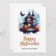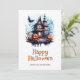 Carte d'Halloween avec une maison hantée, la pleine Lune, les chauves-souris et un squelette fantôme. Personnalisez facilement cette carte d'Halloween aquarelle avec votre nom de famille et votre texte.