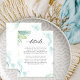 Carton d'invitation simple et élégant avec des détails modernes où vous pouvez ajouter des informations supplémentaires pour vos invités. Liberté d'ajouter les informations que vous souhaitez et même de taper directement sur l'écran d'édition et de faire les ajustements de texte que vous souhaitez en sélectionnant "personnaliser davantage". Fond aquarelle délicat turquoise, aqua, bleu poussiéreux et vert avec des taches dorées factices sur le devant et le dos, ainsi que des détails de verdure dans les coins sur le devant. Feuilles et feuillages en sarcelle, aqua, vert citron, vert sauge et or. Détails de calligraphie manuscrite moderne. Fait partie de notre collection "Aquarelle bleue et verte aérée" avec une variété de produits coordonnés.