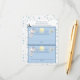 Ruples de couche spatiale, deux par feuille, avec étoiles bleues sur arrière - plan. Chaque carte est bleu clair avec un astronaute, un vaisseau spatial et une lune jaune pâle. Découpez et insérez dans l'enveloppe des invitations correspondantes.