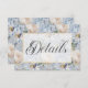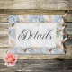 Ce design de carte de détails mariage présente un beau motif floral bleu et blanc pervent doux sur un arrière - plan d'âge bleu perwinkle poussiéreux. Le texte s'affiche sur une zone de texte transparente blanche et souple avec un cadre de parties scintillant en faux or. le dos continue le motif floral. Cette carte fait partie de la suite de mariage Blue & White Floral Gold Frame créée par Simply Farmhouse Press.