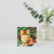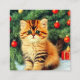 Cartes de fermeture avec un chat de Noël vintage ! Un chaton orange à rayures noires est assis dans la neige. Derrière le chat se trouve un sapin de Noël aux ornements rouges et jaunes. Aussi sur la neige est un cadeau rouge. Un cadeau parfait pour la saison de Noël et les amoureux de les chats!