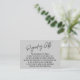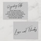 Ces inserts de carte simples et distinctifs ont été conçus pour correspondre à d'autres éléments dans une suite événementielle en pleine croissance qui comprend une police d'écriture décontractée moderne sur un arrière - plan simple que vous pouvez changer à n'importe quelle couleur que vous voulez. Sur le côté avant vous lisez "Concernant les cadeaux" dans le type présenté; sur le dos, j'ai placé une correspondance "Amour et Merci". Le type modifiable est rendu dans une police serif entièrement casquette. Mon message porte-parole dit : "La chose la plus importante est de vous avoir avec nous lors de notre journée spéciale. Aucun cadeau n'est nécessaire ou attendu, mais on nous a demandé ce dont nous avions besoin ou ce que nous voulions. Si vous voulez nous donner quelque chose, un peu d'argent à dépenser pour notre lune de miel serait très apprécié." N'hésitez pas à utiliser les champs du modèle et à modifier cette copie avec votre propre message personnel pour faire de ces cartes votre propre carte. // 151 //