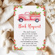 Cette jolie carte de demande de livre d'aquarelle amusante comporte un camion rose rustique plein de fraises. Le texte combine écriture manuscrite et polices sans serif pour un look élégant et moderne. Idéal pour un baby shower d'été.