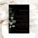 Cette carte de détails de mariage minimal au eucalyptus formel noir est parfaite pour compléter un mariage rustique. Le design présente un feuillage d'eucalyptus vert aquarelle sur un fond noir.