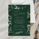 Elégante carte de détails de mariage botanique avec vos détails nichés dans un cadre rectangulaire entouré d'eucalyptus, fougères et autres riches verdure sur un arrière - plan vert foncé. Ajoutez des détails tels que l'hébergement à l'hôtel, les informations sur la réception de bienvenue, le site du mariage, etc. Conçu pour coordonner avec notre collection de mariages de verdure Abondante.