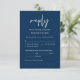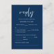 Il s'agit de la belle carte de boîtier Modern, Calligraphy, Elegant RSVP (Respond), en police bleu marine, où vous pouvez modifier, modifier la couleur et le format selon vos besoins de conception, avec options de repas, sièges réservés, nombre de participants et option de demande de chanson. #TeeshaDerrick