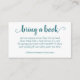 CARTE DE REQUÊTE DE LIVRE : Luxueux bleu turquoise, aquamarine, marine et blanc "apporter un livre" baby shower ou genre révéler carte de clôture de soirée avec un script amusant, décontracté écrit à la main. Le design classique comprend une typographie moderne de citation à main superposée avec un poème : "Une seule demande et nous espérons que ce n'est pas difficile | apportez à votre bébé un livre au lieu d'une carte | en signant votre nom, nous nous rappellerons et partagerons | votre cadeau spécial même lorsque vous n'êtes pas là" Pour d'autres couleurs ou des produits assortis, visitez le magasin JustFharryn Zazzle, ou contactez le concepteur, c/o Fharryn@yahoo.com Tous droits réservés. #bohochic #zazzlemade