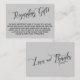 Ces élégantes cartes d'insertion ont été conçues pour correspondre à d'autres éléments d'une suite événementielle en pleine croissance qui comprend un script tourbillon élaboré sur un arrière - plan solide que vous pouvez changer à n'importe quelle couleur que vous voulez. Sur le côté avant vous lisez "Concernant les cadeaux" dans le script ; sur le dos, j'ai placé un graphique magnifiquement rendu des mots "Amour et Merci". Tout type modifiable est rendu dans une police sans-serif entièrement casquette. Il suffit d'utiliser les champs modèles et de remplacer mon texte de remplissage par vos propres détails personnels pour faire de ces cartes votre propre. // 98 //