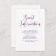 Cette carte d'information simple et élégante fait partie de notre collection de mariages "Modern Watercolor Floral" et présente un arrière - plan blanc avec une élégante typographie violette. Vous pouvez utiliser ces cartes pour inclure des informations sur la réception de votre mariage, les itinéraires routiers, l'hébergement et tout ce que vous avez besoin de connaître de vos invités.