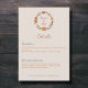 Une Carte de Boîtier avec des détails et l'ordre chronologique des événements à envoyer aux invités de votre mariage sur le thème de la nature et la forêt. Elle est accompagnée d'une illustration de couronne comprenant des feuilles d'érable, de hêtre, de chêne et de noisette, de champignon, de glacier, de citrouille, de châtaignes et de noix aux couleurs de l'automne.