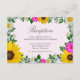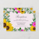 Invitation mariage campagnard rustique avec des tournesols vibrants, des marguerites blanches traditionnelles et des fleurs roses contre un arrière - plan rose clair avec l'haleine de bébé et des accents de verdure botanique