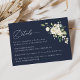 Complétez votre papeterie mariage avec cette carte de détails élégante. Le design présente des fleurs d'aquarelle blanche et de la verdure sur arrière - plan bleu marine.