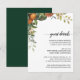 Jolie, élégante, moderne et bohème détails mariages des chambres d'hôtes cartes d'enceinte pour votre occasion spéciale! Le design s'accorde avec le reste de la collection de feuillages d'Orange Leaf. Aquarelle fruit orange avec bordure côté feuillage feuille foncé et vert clair encadre le haut de votre mariage détails fiche de l'enceinte détails. Personnalisez avec les détails souhaités tels que l'hébergement à l'hôtel, les codes de groupe, le transport, l'itinéraire, les informations de bienvenue à la réception, et votre URL du site Web mariage.