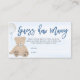 Baby shower garçon mignon ours en peluche devinez combien de cartes/billets. Un ours en peluche brun doux assis tenant un ballon sur un arrière - plan d'aquarelle bleu clair.