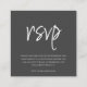 Vous cherchez la carte de réponse parfaite pour votre mariage ? Ne cherchez plus ! Notre carte de réponse de mariage moderne et compacte personnalisable présente une typographie élégante en écriture blanche qui est sûre d'impressionner vos invités. Avec un fond chic gris foncé, vous pouvez facilement inclure votre propre texte personnalisé pour le rendre vraiment unique. Au verso, créez un tout nouveau code QR qui renvoie directement à votre site web de mariage pour un accès facile et pratique. Allez à l'option "personnaliser", ajoutez l'URL de votre site web de mariage dans la zone prévue, et un code QR sera généré sur le design juste pour vous. Commandez maintenant et laissez les réponses arriver !