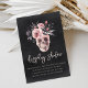 Un design éffrayant et chic de carte d'enceinte de douche à nuptiale avec illustration crâne florale surmontée de fleurs d'aquarelle rose et violet sur un arrière - plan noir fumé. Ajoutez cette carte d'enceinte de douche à l'écran à vos invitations de douche nuptiale pour encourager les invités à apporter leurs cadeaux non emballés.
