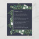 Conçu pour se coordonner avec notre collection de mariage Greenhouse, cette carte d'information pour les invités botanique élégante et frappante présente une bordure de feuillage vert en aquarelle, de feuilles botaniques et de petites fleurs blanches encadrant vos détails de mariage clés, tels que les informations d'hébergement à l'hôtel, les informations de réception de bienvenue, le site web et plus encore sur un fond bleu marine riche.