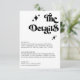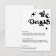 Cette "Retro Black and White Super Bold Script Mariage Encape Card" dispose d'un arrière - plan blanc propre avec du texte noir gras, offrant un design chic et intemporel. Le script super apporte une touche de charme rétro tout en conservant une atmosphère moderne et élégante. Parfait pour partager avec vos invités les détails mariages essentiels tels que l'hébergement, les itinéraires ou les notes spéciales.