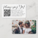 Partagez l'une de vos photos de fiançailles ou de mariage et simplifiez les réponses RSVP avec des cartes de boîtier de code QR modernes. L'image et tout le texte sont simples à customiser, y compris le libellé "Veuillez dire oui !" Pour créer votre propre code QR à l'aide du générateur, tapez simplement l'URL du site Web dans le modèle. En scannant la carte avec leur téléphone, les invités sont envoyés directement sur le site du mariage pour répondre à l'invitation. Un processus rsvp en ligne réduit le risque que les cartes soient perdues dans le courrier. Il est également plus polyvalent, en ce sens que vous pouvez demander des informations plus détaillées, comme les choix de repas, les allergies alimentaires et les demandes de chant. Toutes les informations de réponse peuvent être personnalisées ou supprimées. Le design noir et blanc présente une typographie minimaliste moderne, une calligraphie manuscrite et 1 photo de votre choix. Cette carte est une façon élégante de demander aux invités mariages de répondre gentiment à votre prochaine célébration de la journée spéciale.