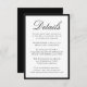 This wedding details card features “Details” in elegant black calligraphy script at the top, followed by your custom wedding information presented in classic serif lettering. A bold black border frames the design, creating a clean, refined look that feels timeless and polished. The structured layout provides a beautiful way to share accommodations, weekend events, and important information with your guests, making this black and white details card ideal for modern, classic, and formal wedding celebrations. Personalize the wording to create an insert that feels cohesive, elevated, and thoughtfully designed.