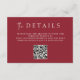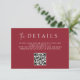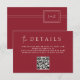 Une carte mariage simple et élégante Détails boîtier avec style contemporain et un look sophistiqué en rouge canneberge avec texte ivoire. Il dispose d'une disposition minimaliste attrayante, d'une typographie élégante, d'un QR Code à personnaliser avec votre site mariage pour connecter les invités à tous les détails et RSVP. De plus, le dos de la carte a un modèle à personnaliser avec les initiales monographiques de la mariée et du marié et donne le ton parfait pour votre célébration. Customisez avec vos informations de mariage et vos initiales monographiques.