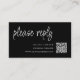 Rendez votre processus de réponse de mariage transparent avec notre carte de réponse avec code QR. Cette carte personnalisable présente une écriture blanche moderne sur un fond chic noir. Le design comprend une zone de texte personnalisable et un espace pour générer un code QR unique permettant aux invités de répondre facilement via leur smartphone. Allez à l'option "personnaliser", ajoutez l'URL de votre site web de mariage dans la zone prévue, et un code QR sera généré sur le design rien que pour vous. Rendez votre journée spéciale encore plus mémorable avec cette carte de mariage chic et fonctionnelle.