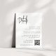 Carte tout-usage pour vos invitations de mariage, cette petite carte de détails fournit trois champs de texte personnalisés pour vos détails de mariage, le site Web, et un code QR pour les RSVP ou des informations supplémentaires. Conçu pour correspondre à nos invitations de mariage de Script manuscrit moderne. Une belle conception typographique à l'atmosphère minimaliste, avec un script manuscrit noir de cendre moderne et des lettres serif classiques.