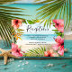 Entrez dans un paradis tropical et informez vos invités des détails de votre réception avec ces cartes d'enclos inspirées de l'île avec une plage de sable aquarelle et des vagues océaniques turquoise arrière - plan bordé de fleurs d'hibiscus roses et coraux et de feuilles de palmiers.