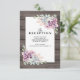 Cartes d'invitation de réception de mariage chic campagne avec un fond de grange en bois rustique, un coin de succulentes et un modèle de texte de mariage.