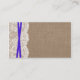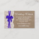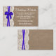 La collection rustique de mariage bleu arc est un design étonnant avec un joli arrière - plan rustique effet burlap avec un cadre romantique vintage effet dentelle blanche et un ruban bleu foncé avec arc. Ces cartes d'insertion de site web mariage peuvent être personnalisées pour votre occasion spéciale et feraient l'insert parfait assorti pour toute suite de mariage rustique, douche nuptiale, fête de fiançailles, fête d'anniversaire et bien plus encore. Ces cartes peuvent être utilisées pour créer des cartes de détail, des cartes d'information pour les clients, des cartes d'hébergement, des cartes de direction, des cartes d'enregistrement des cadeaux ou des cartes de puits de souhaits, ainsi que des cartes de cérémonie et de réception. *Veuillez noter que Zazzle ne vend que des cartes imprimées afin que ces cartes n'aient pas de matériel réel pour le burlap, la dentelle, le ruban ou l'arc.