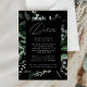 Elégante carte de détails de mariage botanique avec vos détails nichés dans un cadre rectangulaire entouré d'eucalyptus, fougères et autres riches verdure sur un arrière - plan noir. Ajoutez des détails tels que l'hébergement à l'hôtel, les informations sur la réception de bienvenue, le site du mariage, etc. Conçu pour coordonner avec notre collection de mariages de verdure Abondante.