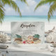 La carte de réception de mariage d'inspiration insulaire présente un arrangement d'hibiscus tropicaux, de fleurs de flamants et de jasmin et de feuilles de palmiers avec un arrière - plan de lave-linge bleu aqua. A l'inverse, une abstraite feuille de palmier dans les tons beige kaki et taupe. Parfait pour la plage, la destination et les thèmes tropicaux.