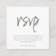 Vous cherchez la carte de réponse parfaite pour votre mariage ? Ne cherchez plus ! Notre carte de réponse de mariage moderne et compacte personnalisable présente une typographie script stylée qui est sûre d'impressionner vos invités. Avec un fond vert forêt et blanc, vous pouvez facilement inclure votre propre texte personnalisé pour le rendre vraiment unique. Au verso, créez un tout nouveau code QR qui renvoie directement à votre site web de mariage pour un accès facile et pratique. Allez à l'option "personnaliser", ajoutez l'URL de votre site web de mariage dans la zone prévue, et un code QR sera généré sur le design juste pour vous. Commandez maintenant et laissez les réponses arriver !