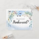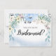 Belle façon de demander à un ami d'être votre demoiselle d'honneur. Des fleurs d'aquarelle bleue encadrent votre carte de femme de chambre en haut et un lavabo bleu très branché et branché encadre le fond.