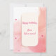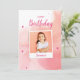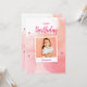 Ce design est une carte d'anniversaire festive comportant une image joyeuse d'une jeune fille souriante. Le fond présente une texture d'aquarelle rose avec des paillettes dorées et des étoiles flottantes, ajoutant une touche fantaisiste et festive. Les mots "Joyeux Anniversaire" sont affichés bien en vue dans une police cursive ludique, ce qui en fait une carte idéale pour exprimer des vœux d'anniversaire chaleureux.