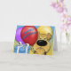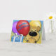 Adorable Airedale Terrier avec un cadeau d'anniversaire et tenant des ballons dans sa bouche. Le ballon dit Rappy Rirthday !